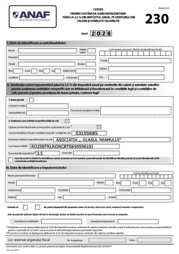 Descărcați Formularul 230 completați-l, pozați-l sau scanați-l și trimiteți-l pe adresa de email admin@glasul.info