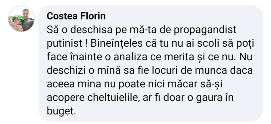 Cât de ușor este să îngurgitezi propaganda antiromânească și să nu pui deloc mintea la contribuție. Minele au fost sabotate și închise premeditat, au fost “făcute” neprofitabile prin prostul management și prin multă hoție. De ce sunt profitabile peste tot prin lume și numai la noi nu? Eliminând hoția și trădarea, se pot face profitabile și la noi!